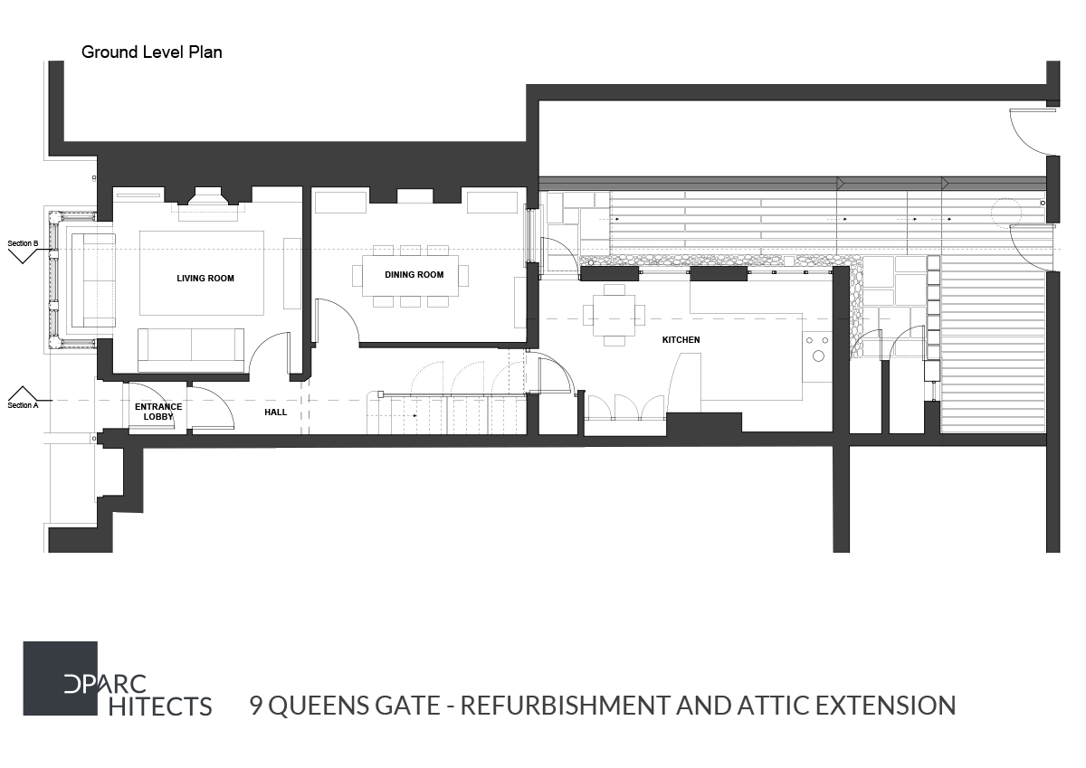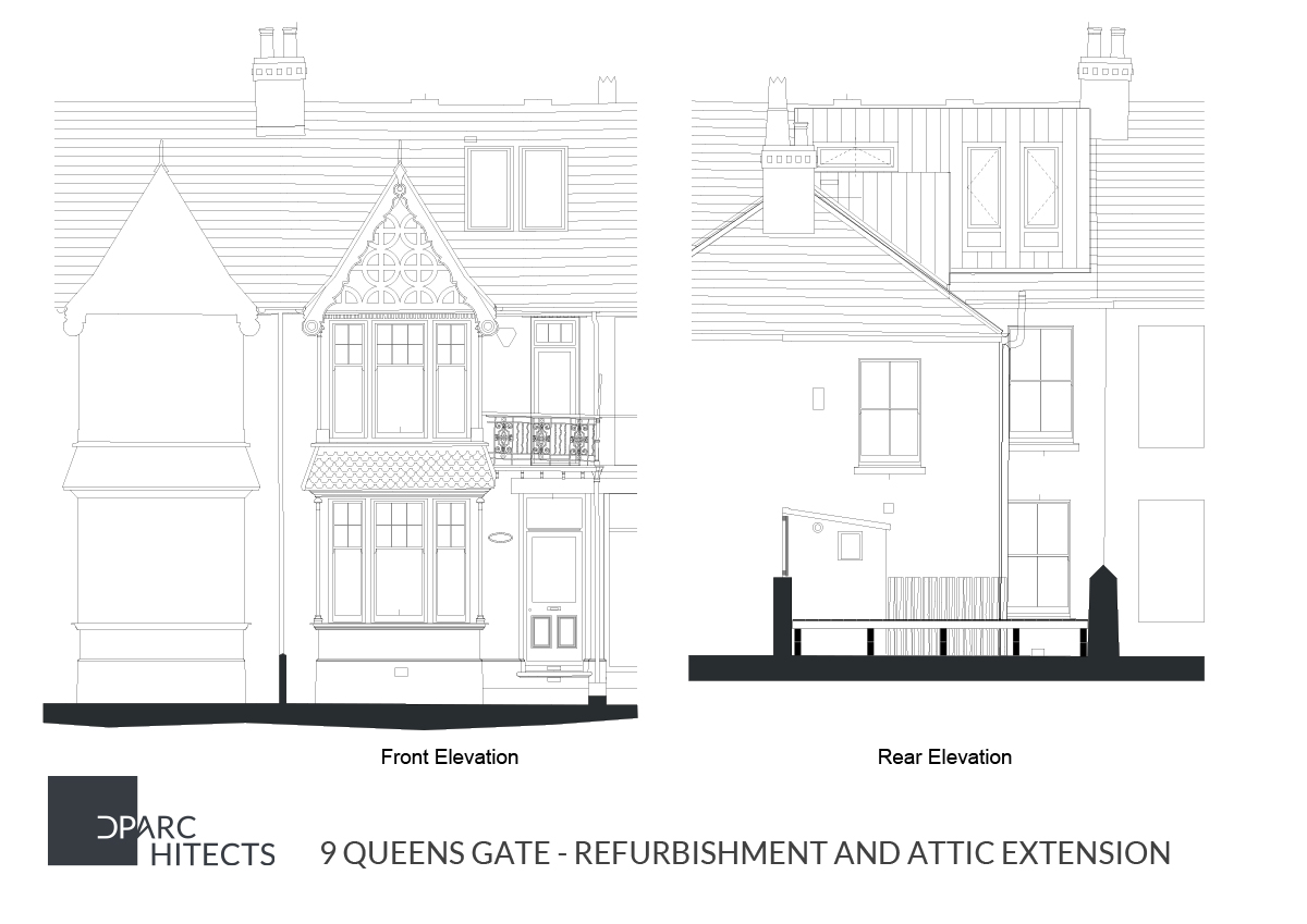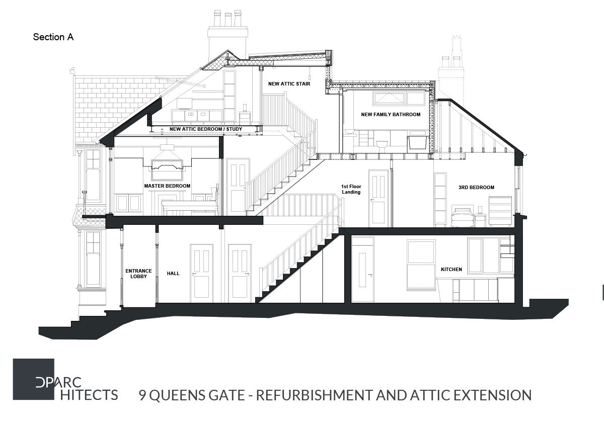 The roof level loft extension was clad with ZM Zinc to create a contemporary insertion over the Edwardian house and was the first Approved (Planning & Building Regs) within Queens Gate which increased the value of the property by approx. 20%.