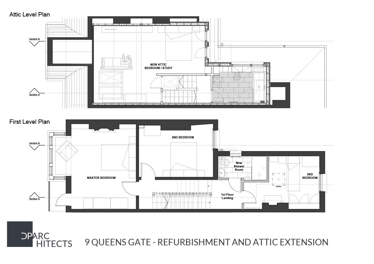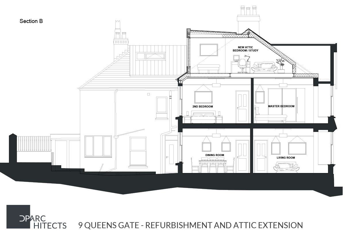 A private residential house constructed circa 1908, the Edwardian three-bedroom terraced house was refurbished and extended with two rooftop loft extensions creating a new double bedroom / study within the main roof space and a lower family bathroom over the rear tenement return.