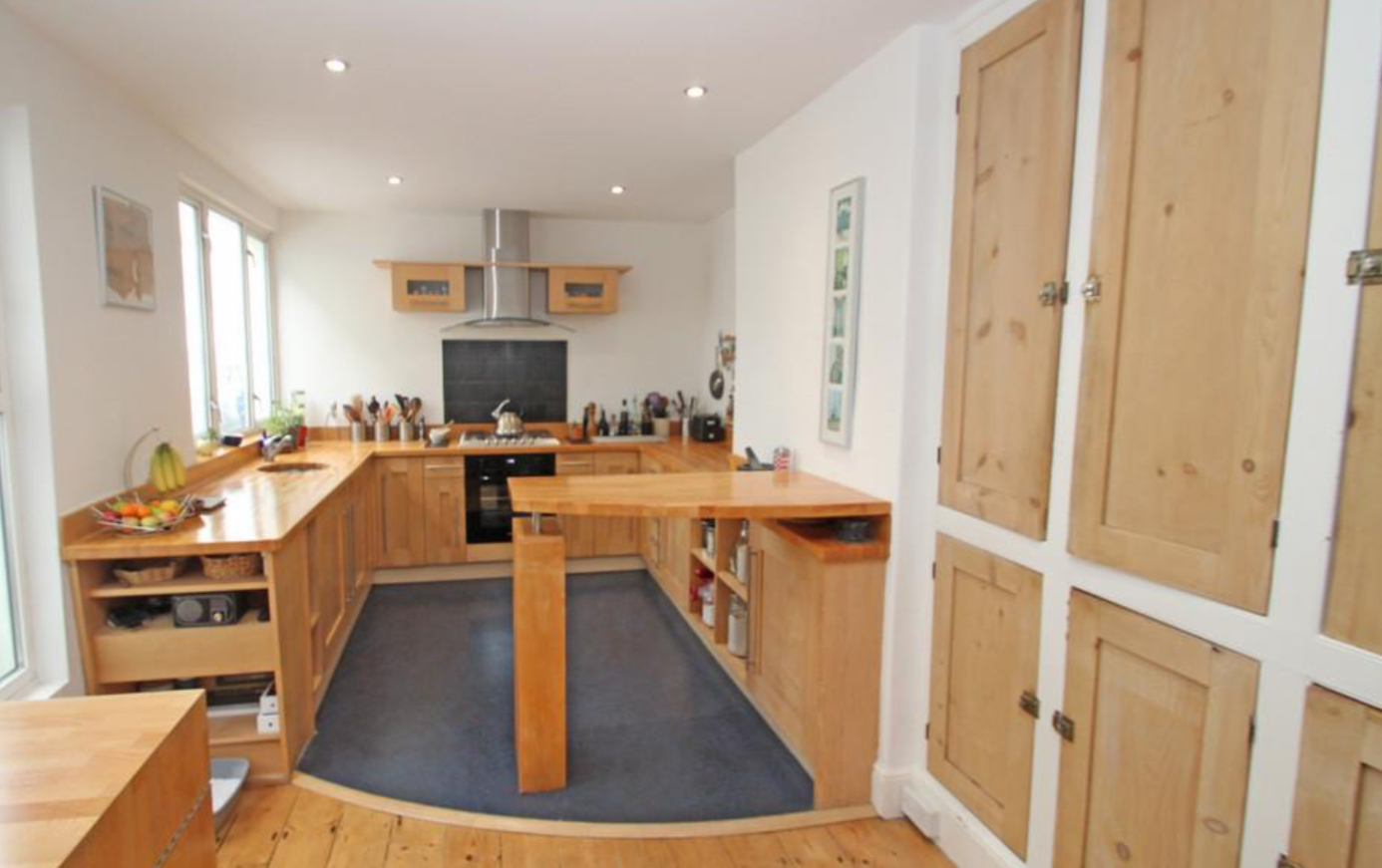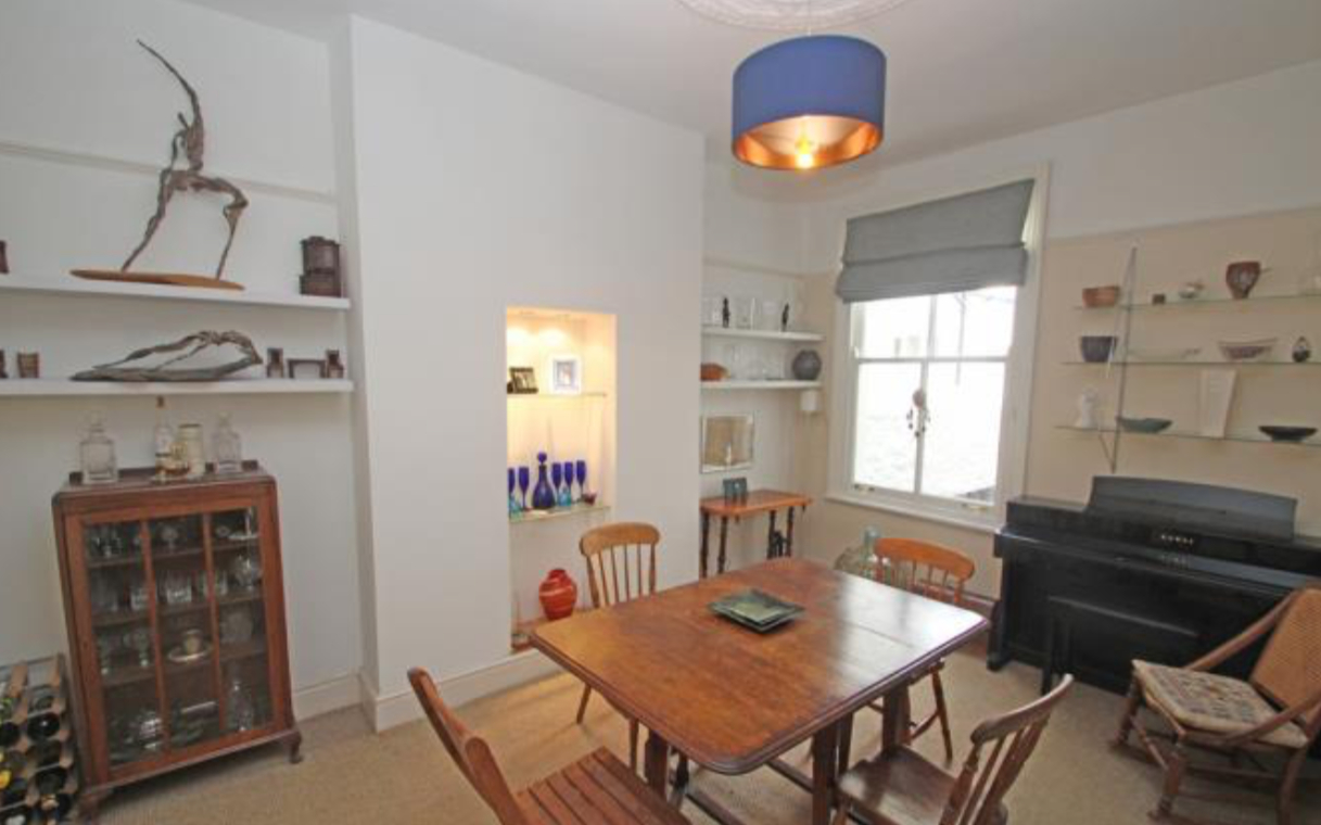 The kitchen was refurbished with a bespoke kitchen design by DP Architects with solid maple facing doors and European beech work tops. The dining room was also refurbished with a central glass shelving opening replacing the original fireplace, creating a new spot lit storage / exhibition space.